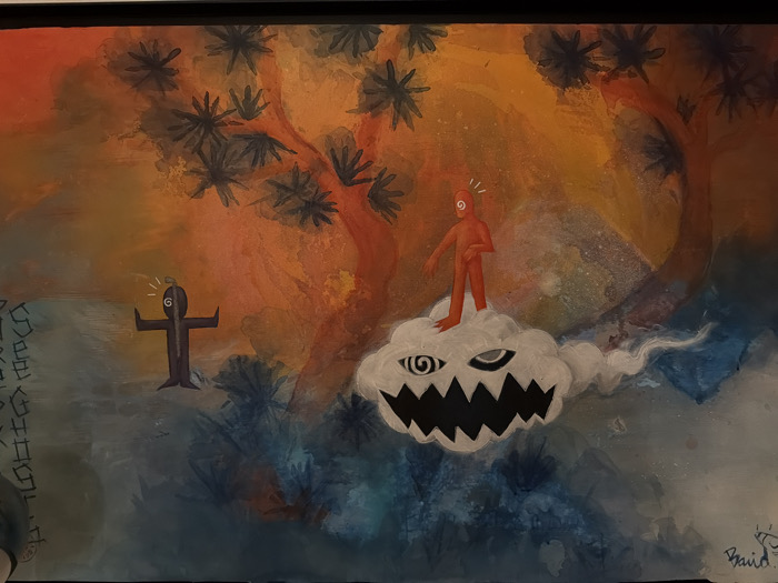 A framed, mixed-media painting depicts a surreal landscape, observed in Saint-Denis, France