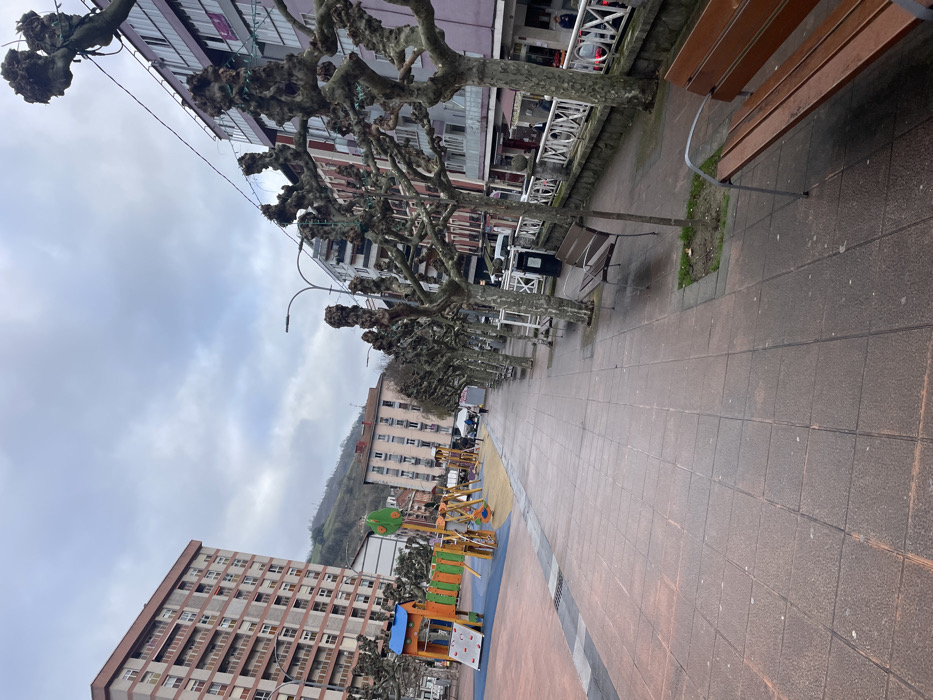 The image depicts an urban public space identified as Plaza de Unzaga in Eibar, Spain, under an overcast sky. A wide pedestrian walkway, paved with red and grey square tiles, extends from the foreground into the background. To the left of the walkway is a children's playground featuring a blue rubberized safety surface with various colorful play structures, including a multi-level playhouse with an orange slide, yellow panels, and a blue roof, alongside yellow and blue swing sets and other climbing equipment. To the right of the walkway, a linear arrangement of approximately ten heavily pollarded deciduous trees with bare, gnarled branches runs parallel to the path. Green string lights are visible wrapped around some tree branches. Multiple dark brown wooden slatted benches with silver metal frames are positioned along this tree line. Further right, a low stone wall topped with white decorative balustrades separates the pedestrian area from an adjacent street or lower section of the plaza. In the background, on the far left, a tall, multi-story residential building with a reddish-brown facade and numerous light-colored balconies is prominent. Behind the playground, green, tree-covered hills rise in the distance. Along the right side, beyond the trees, a series of multi-story urban buildings line what appears to be a street, including one building with a purple facade and others with red and white elements, some featuring ground-level storefronts. Streetlights with curved arms are visible above the trees and buildings. Minimal human presence is observed; a lone individual is walking in the distant mid-ground along the main thoroughfare, and a few indistinct figures are faintly visible near the buildings on the right side. No specific interactions or detailed actions are discernible among these individuals. The overall lighting is diffused, consistent with an overcast day.