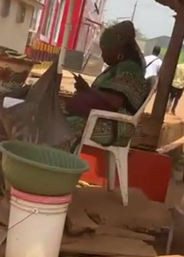 street scene, likely in an African country. An African woman wearing a headwrap and patterned dress is sitting in a white plastic chair under a makeshift shelter. She is looking at her phone. Next to her is a stack of old car tires, on top of which sits a weathered enamel bowl full of what appears to be fried plantains. A white car drives past in the background. The ground is dirt or sand. Other people can be seen walking in the distance.