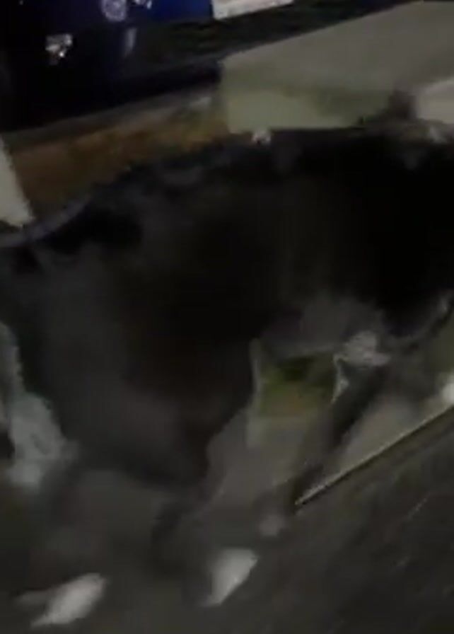 black and white dog walking along a dimly lit sidewalk at night