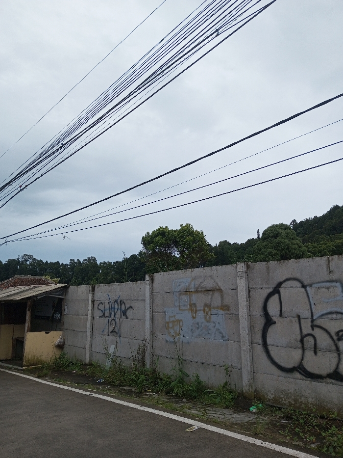This image depicts an outdoor scene in Ambakirano, Madagascar, under an overcast sky. Numerous dark electrical or communication lines traverse the upper portion of the frame diagonally. Below these lines, a densely forested hillside with various green trees dominates the background. In the midground, a gray pre-fabricated concrete wall spans horizontally, featuring multiple sections. This wall is marked with graffiti: "SLVPR / 12" in black on one section, a yellow outline of a vehicle over light gray on another, and black bubble-style letters partially visible on the rightmost section. Weeds and sparse vegetation grow along the base of the wall. To the far left, a small, rustic structure with a corrugated metal roof and light-colored walls is visible, appearing to be an open-fronted shack or shelter. A dark asphalt road with a faded white edge line runs across the bottom of the frame, separating the viewer's perspective from the wall and structure. No people or active interactions are present.