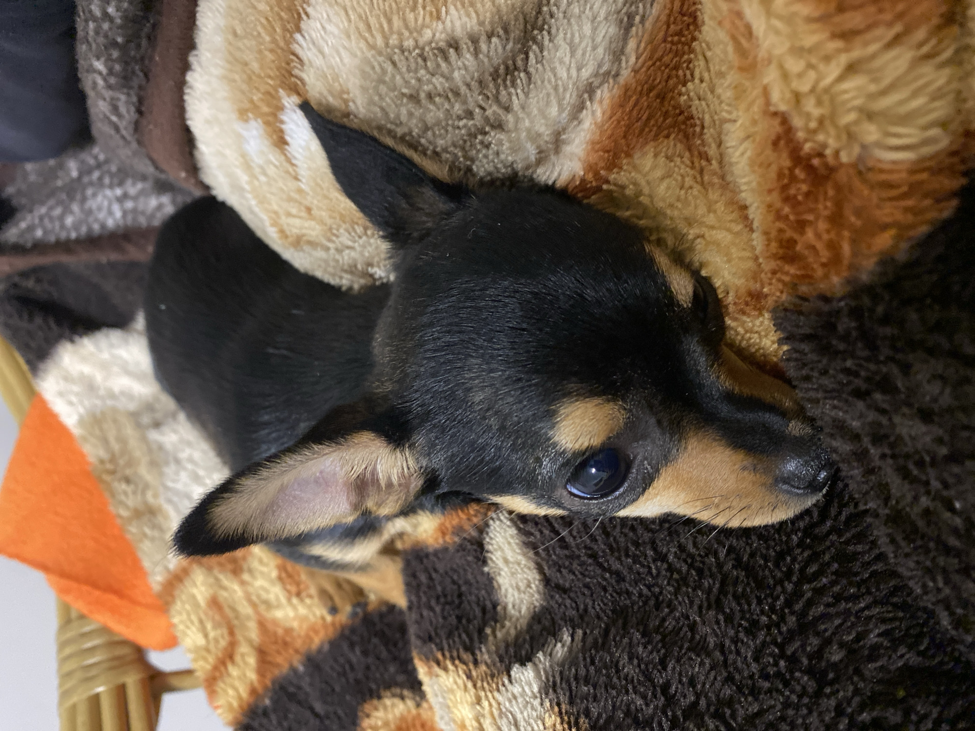 - "A close-up, high-angle shot shows a black and tan miniature pinscher dog lying on a multi-colored, fuzzy blanket" by FM-NrEC42, licensed under CC BY 4.0