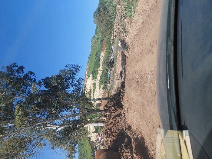 The image displays an outdoor scene from the perspective of a vehicle, in Sidi Moussa Ben Ali, Morocco. A dark dashboard occupies the lower portion of the frame, with a light-colored stack of papers or a book visible on the left side of the dashboard. Directly ahead, a wide, unpaved dirt road or track, marked by uneven terrain and scattered debris, extends into the midground. To the left of the road, substantial mounds of reddish-brown earth are piled, partially obscuring large, light-colored cylindrical objects (possibly pipes or pottery) embedded within them. Two tall, deciduous trees with light-colored bark and green foliage stand prominently on the left, rooted in the disturbed earth. To the right of the road, further back, a stack of cut wood or branches is visible. The background features a large hill or mountain range. The lower slopes of this hill are covered in green vegetation, while the upper sections show significant areas of exposed, light-colored earth or rock, consistent with excavation or natural erosion. Scattered, small, light-colored structures, possibly dwellings or temporary shelters, are visible on the distant slopes of the hill. The sky above is clear and bright blue. No individuals, specific actions, or direct interactions are visible within the frame.