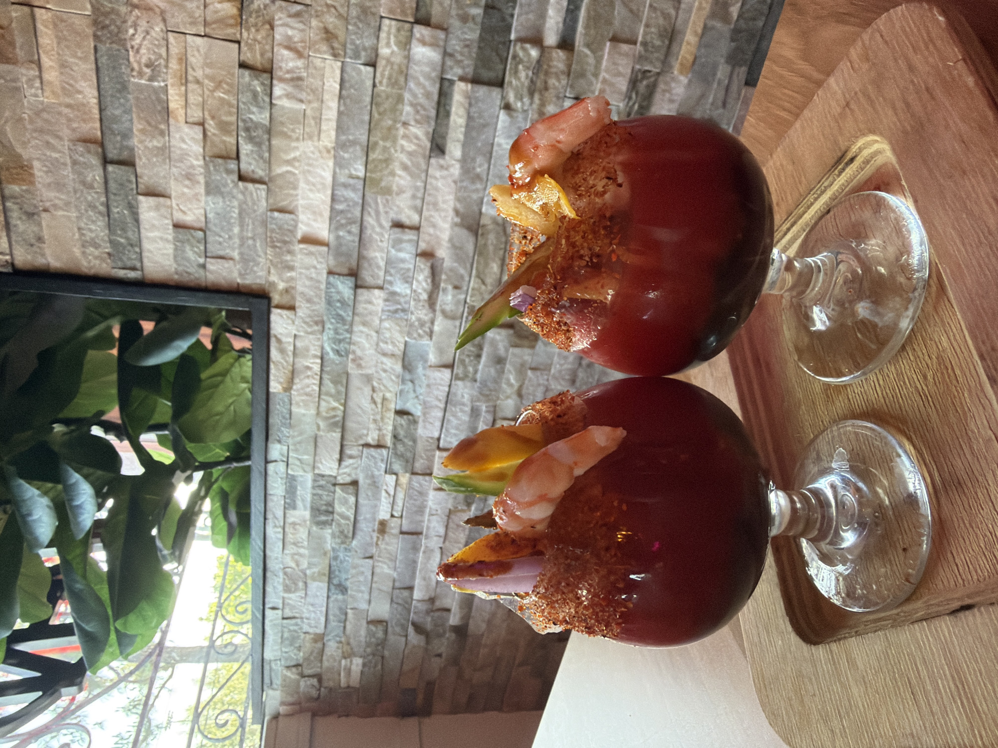 Two shrimp cocktails are presented in stemmed glasses with chili powder rims, garnished with avocado and shrimp. They sit on a wooden tray. A textured stone wall is visible in the background, and there is also a window with greenery outside. This image was likely taken in the city of Paramount, United States of America.