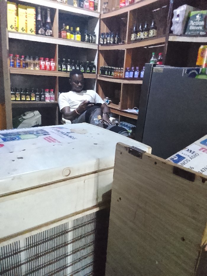 A man sits in a chair in a store, looking at a phone. Shelves behind him display various bottles and boxed items. In front of him are a large white freezer and a wooden panel. The store appears to be a small shop selling alcoholic beverages. The man is wearing a white t-shirt and dark pants. The scene is indoors, with artificial lighting.