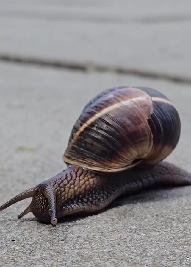 brown garden snail moving slowly across a gray concrete surface