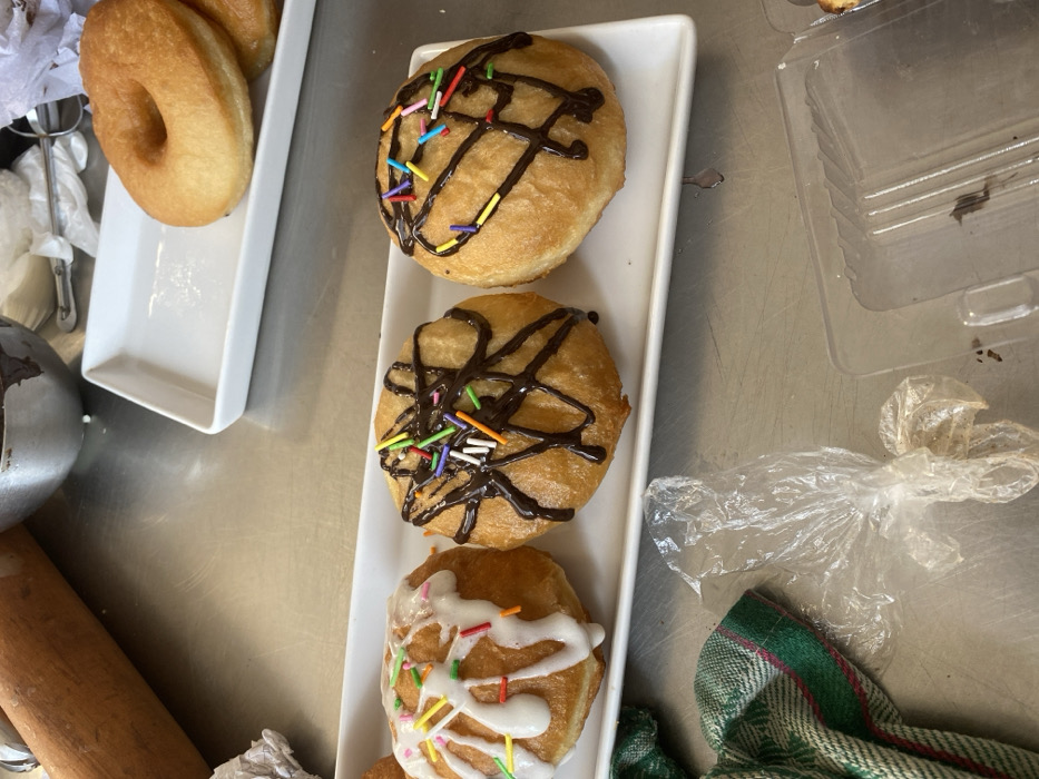 The scene depicts a kitchen or food preparation area in Gwarinpa, Nigeria. A brushed metallic countertop serves as the primary surface, showing minor smudges and reflections. In the central foreground, a white rectangular serving plate holds three round, fried dough items. The leftmost item is topped with white icing drizzle and multi-colored sprinkles. The two adjacent items each feature dark chocolate drizzle and multi-colored sprinkles. To the immediate left of this plate, a green and white checkered fabric is partially visible, alongside a crumpled clear plastic bag. To the right, a clear plastic clamshell container, open and containing dark residue, is present. In the upper background, a second white rectangular serving plate holds two plain, ring-shaped, light-brown donuts. A wooden rolling pin, a partially visible metal bowl containing dark residue, and crumpled aluminum foil are also visible in the upper-left background. No individuals are present.