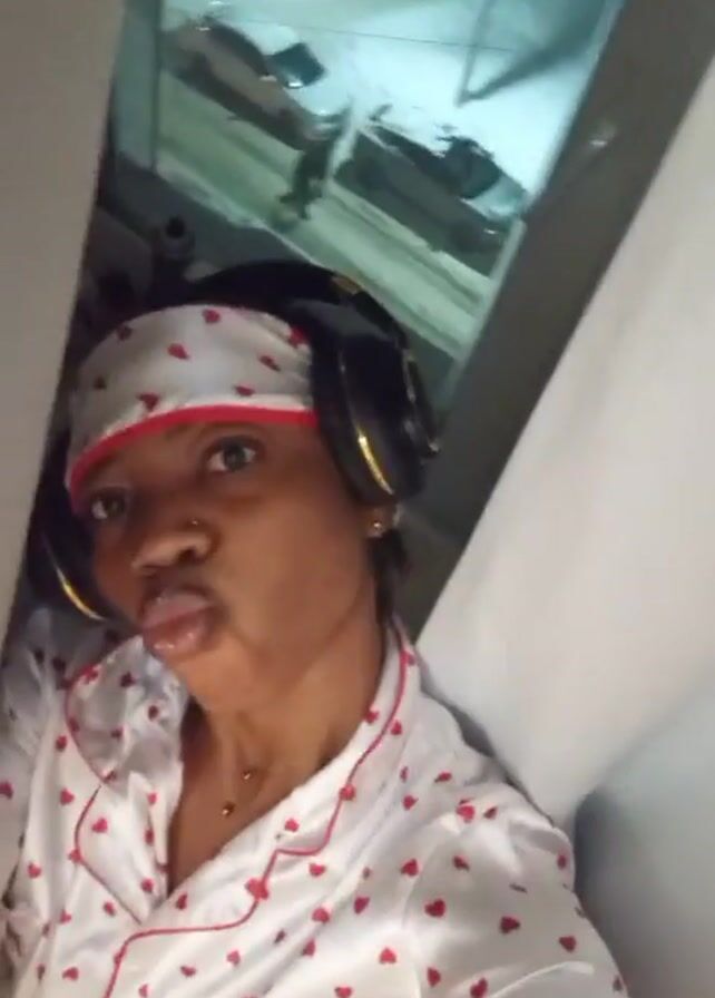 A person wearing a white pajama top with red hearts, a matching head scarf, and headphones looks directly into the camera