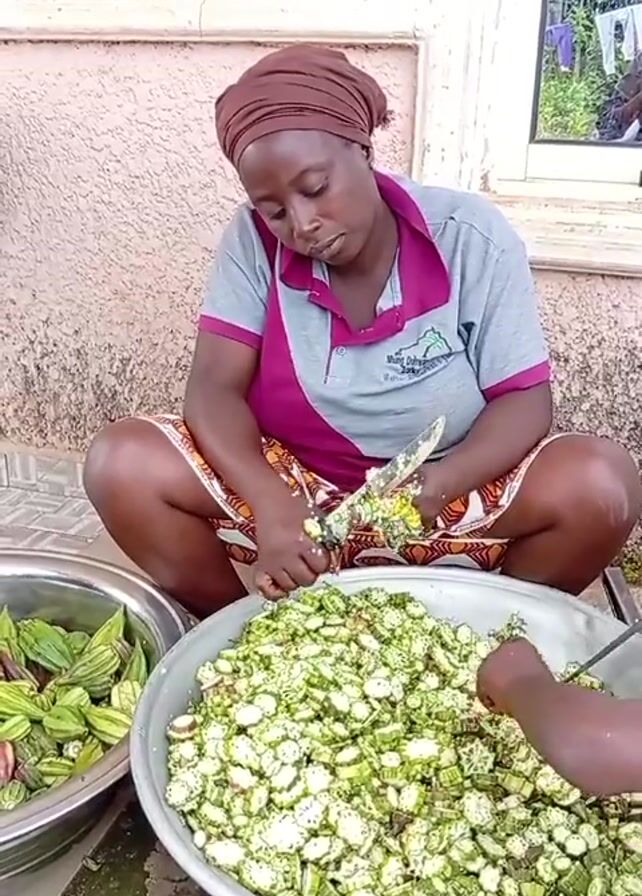 A woman with dark skin sits cross-legged outside a building, chopping okro in front of two aluminum bowls