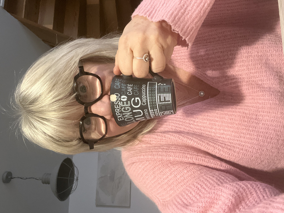 A woman with short blonde hair and glasses is holding a black mug in front of her face. The mug has white lettering with various coffee drinks listed, such as "espresso" and "cappuccino." She is wearing a pink sweater and a ring on her right hand. A staircase and a light fixture are visible in the background.