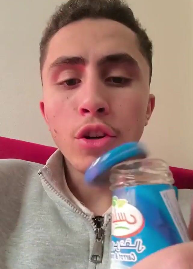A young man with light skin, short brown hair, and a faint mustache is seated on a red couch or cushion, wearing a grey zip-up jacket. He is directly facing the camera. He holds a glass bottle of orange juice, which he raises to his mouth and drinks directly from the bottle. The background is a plain white wall. The camera remains static and close to the subject throughout the video.
