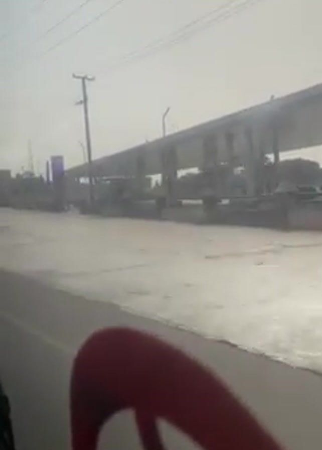 The video is shot from inside a moving vehicle, showing a view of a street with a gas station on the right. The weather appears hazy or dusty. A few people are walking near the gas station, carrying bags. The road is wet. The camera angle is slightly obstructed by the car's interior.