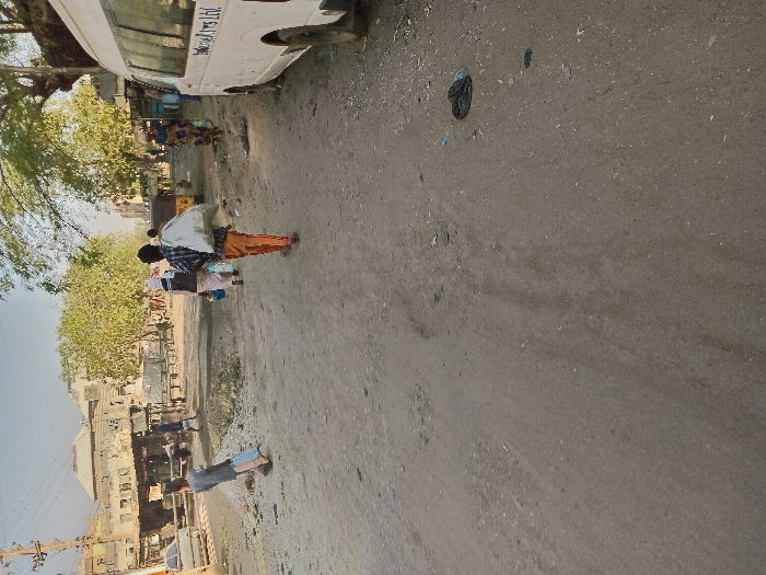 A bustling street scene unfolds under the sun. People walk along a dusty road beside parked vehicles. Buildings line the left side, and trees add a touch of green. A man in orange pants carries a large bundle. The road is uneven, with visible tire tracks and scattered debris.