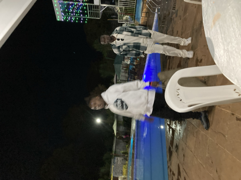 Two people are standing near a swimming pool at night. One wears a white hoodie and black pants, the other a white outfit with a plaid shirt. Decorative lights are visible in the background, and there is a white table and chair in the foreground.