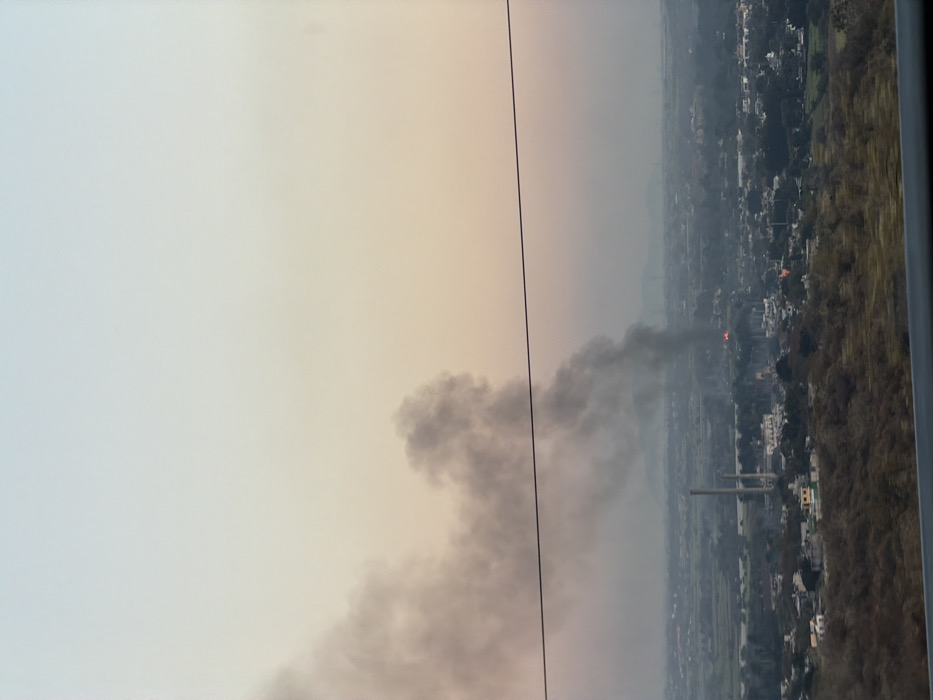 A landscape view with smoke rising from a distant fire in a town or city. The sky is hazy, transitioning from light to a slight orange hue. There are industrial chimneys in the middle ground, and houses with trees on either side. A vertical black wire cuts through the foreground, adding a sense of depth to the scene. The composition is slightly off-kilter.