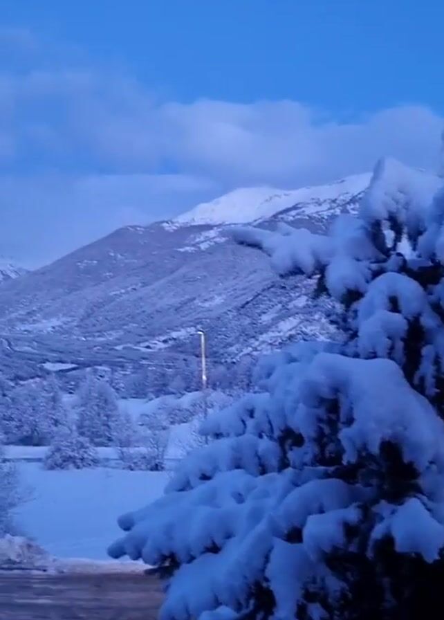 snowy mountain landscape through the branches of snow-covered evergreen trees. The mountains in the distance are dusted with snow. The sky is a blue gradient. A road can be seen at the bottom of the frame. Someone is saying "wow" and "pau pau day".