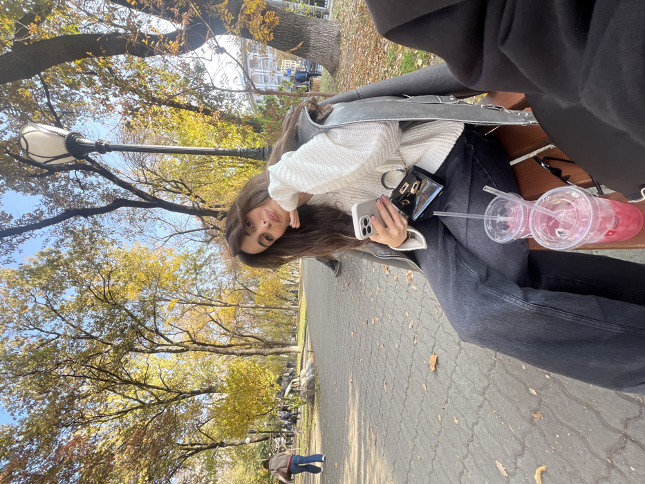 - "A young woman with long brown hair, wearing a cream knit sweater, dark wide-leg jeans, and a grey leather jacket draped over her shoulders, is seated on a wooden park bench" by FM-c63o33, licensed under CC BY 4.0