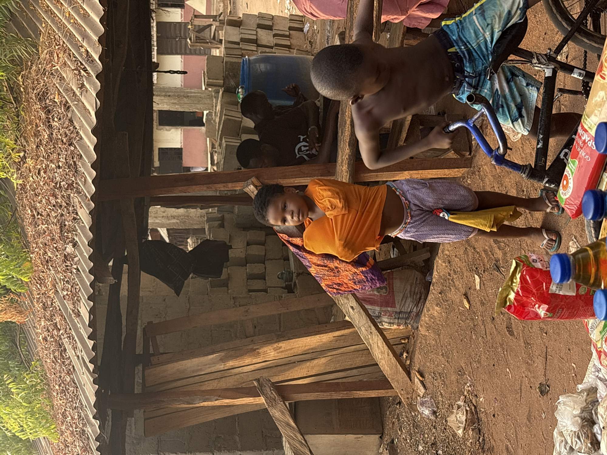 This image depicts an outdoor scene in Lafia, Nigeria, characterized by an informal, semi-constructed environment. In the foreground, a young girl, approximately 4-7 years old, stands center-left, facing forward. She wears an orange t-shirt pulled up over her midriff, revealing a beaded waist chain, light purple patterned shorts, and white flip-flops. A yellow cloth is tucked into her waistband, and a colorful orange and purple patterned fabric is draped over her left arm and shoulder. To her right, a young boy of similar age, bare-chested and wearing blue and white patterned swim trunks, leans over a small, dark-colored bicycle with blue handlebars, his head down as if focused on the bike. The immediate foreground displays merchandise on a low surface, including a red bag (possibly rice), several clear bottles with blue caps (likely containing liquids such as cooking oil), and a red package of "GOLDEN PASTA SPAGHETTI." Various white plastic bags containing other unidentified goods are also present. The ground is dry, reddish-brown earth, with scattered debris. In the mid-ground, a makeshift shelter with a corrugated metal roof covered in dried leaves and debris is supported by wooden posts. Beneath this shelter, two adult males are visible in the background; one is seated in a dark t-shirt with a white graphic, facing away from the camera. Behind them, stacks of concrete blocks are prominently displayed, along with a large blue plastic barrel. Further in the background, residential or commercial buildings with partially painted (reddish-brown) walls and dark window/door openings are visible. Planks of wood are leaned against a wall to the left, indicating construction or storage. Green foliage is visible above the corrugated roof against a bright sky.