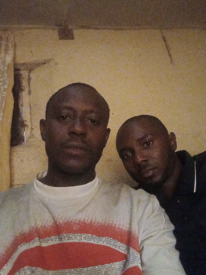 Two dark-skinned men pose closely together. The man on the left wears a white shirt with red and white stripes. His head is bald. The man on the right is also bald and wears a dark-colored shirt with a white stripe visible at the collar. The background is a textured yellow wall with a window partially visible on the left. The image has a slightly grainy quality.