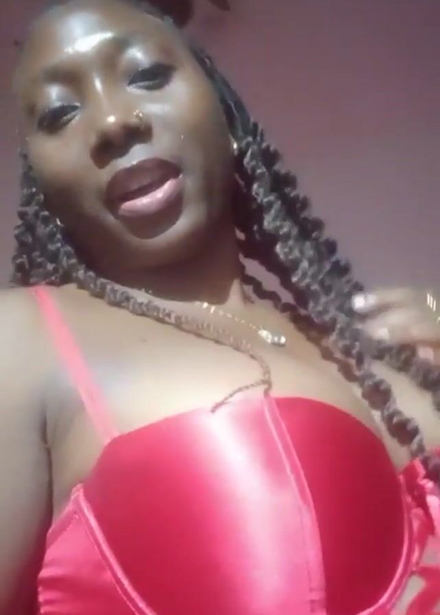 woman with dark skin, wearing a red satin bustier, speaking into the camera. She has long, braided hair and a gold necklace. Her nose is pierced. She says, "Happy Valentine," into the camera. The background appears to be an interior space, potentially a room, with some glimpses of objects. Lighting conditions vary slightly throughout the video.