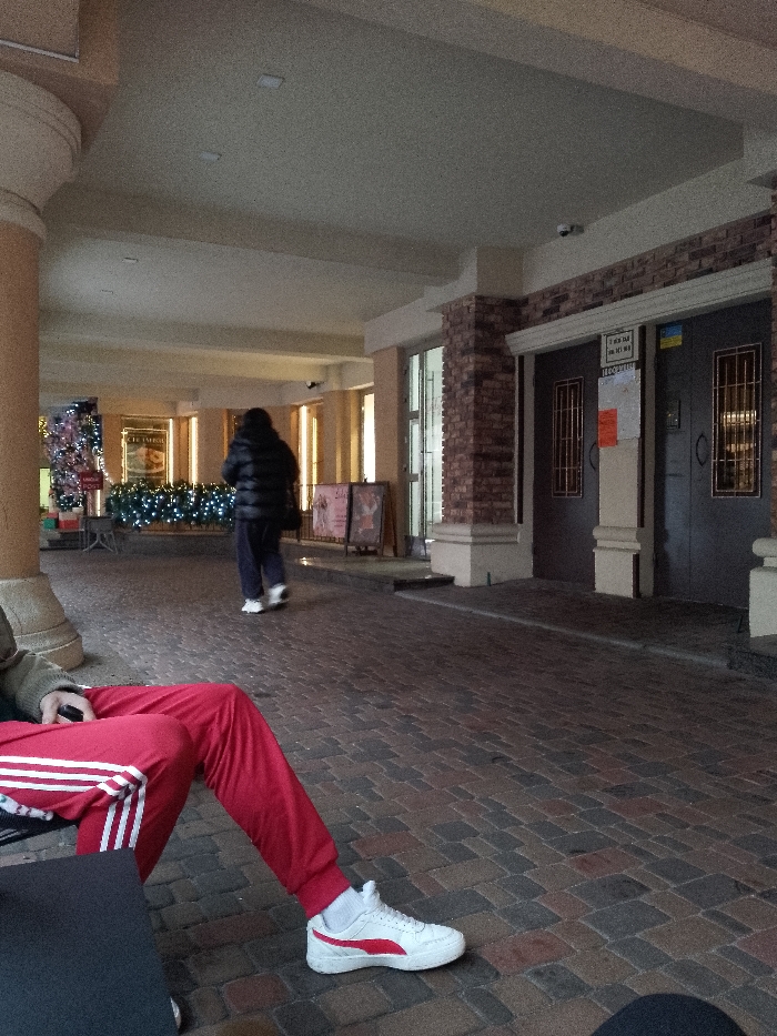 The image displays a covered commercial walkway in Sofiivska Borshchahivka, Ukraine. In the immediate foreground on the left, the lower torso and legs of a seated individual are visible, wearing red sweatpants with white triple stripes on the side seams and white Puma sneakers with red side accents and white socks. A dark object is partially held in their left hand. Approximately centered in the midground, a lone individual walks away from the camera, clad in a dark, possibly black, puffer jacket, dark trousers, and white sneakers. The ground throughout the visible area is paved with dark-toned, brick-patterned tiles. To the left, a decorated Christmas tree-like structure adorned with pink ornaments and string lights stands near a large, light-colored architectural column. A low, horizontally extended barrier or hedge, also illuminated with white string lights, runs along the background. Behind this, a sign for "LE TARGUE" is visible, further surrounded by lights. On the right side of the walkway, two dark-colored double doors feature vertical grid patterns on their upper panels. Multiple notices are affixed to these doors, including one with blue and yellow stripes (Ukrainian flag colors) and text in Ukrainian, and another white notice partially displaying the word "НЕОБМЕЖЕНА" (Unlimited). A security camera is mounted on the light-colored ceiling directly above these doors. To the left of the double doors is a storefront entrance with large glass panels, flanked by faux-brick columns. Two A-frame signs displaying advertisements are positioned near this storefront. The ceiling is light-colored and features recessed lighting fixtures.