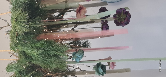An overhead decorative display is suspended against a plain, light-colored background, located indoors in Kifisia, Greece. The primary component is an arrangement of green pine needles and bare branches, from which numerous small, warm-white LED fairy lights are intertwined and hang downwards. Multiple vertical strips of fabric ribbon in pastel shades of light green, pink, and beige also descend from the overhead structure; these ribbons exhibit frayed or uneven lower edges. Several artificial flower heads are individually suspended at varying lengths, featuring colors such as teal-green, pale pink, and deep purple. No individuals are present in the frame.