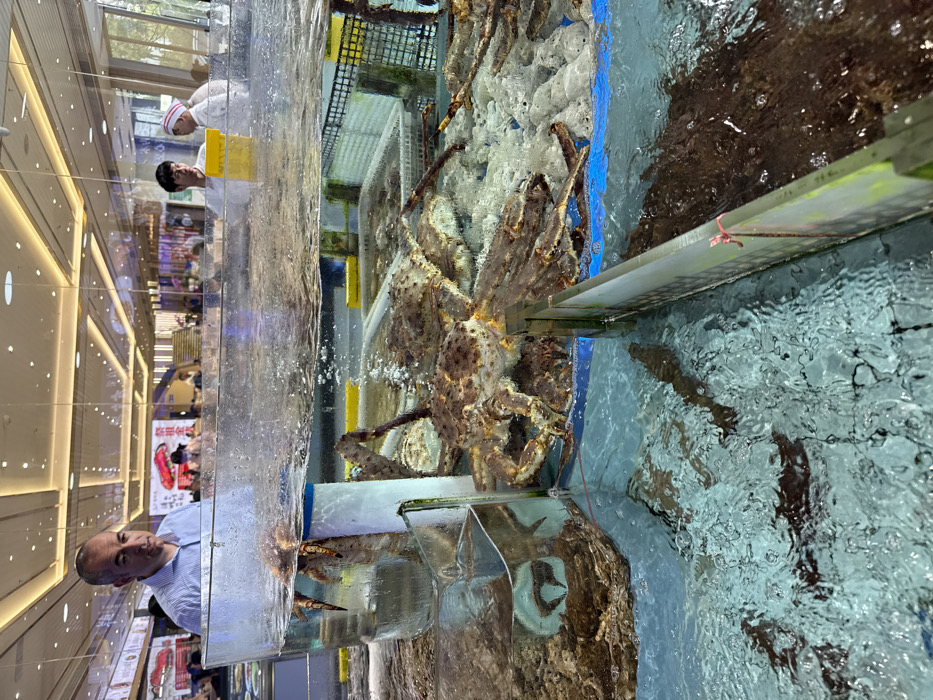 The image depicts the interior of a brightly lit, modern seafood restaurant or market. In the foreground, multiple large, clear acrylic or glass tanks are filled with aerated water, displaying live marine life. Several large King Crabs are prominently featured within these tanks, some partially submerged, while others rest on substrate or ice within partitioned sections. Smaller fish or eels are visible swimming in the clearer water of the lower tank levels. An adult male with short dark hair and wearing a light blue collared shirt stands in the left foreground, intently observing the contents of a tank. In the mid-ground, positioned behind the tanks, an adult male with dark hair wearing a white shirt looks towards the left. To his right, a third adult male, wearing a white chef's hat with red stripes and a white uniform, is partially visible facing right. A yellow informational sign is present above the water line in the mid-ground. The background reveals a spacious dining area with tables, chairs, and a staircase, illuminated by numerous overhead rectangular lights. Large display screens or banners featuring East Asian script are visible. The overall environment suggests an upscale commercial establishment within a city.