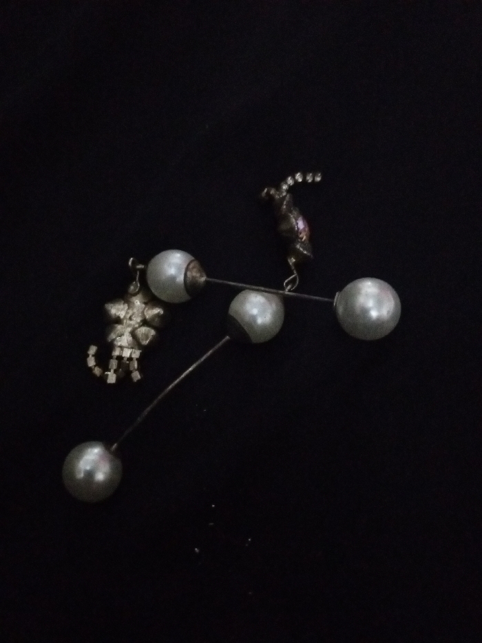 The scene, located in Tagtse Tashidingkha, Bhutan, displays an arrangement of costume jewelry against a matte black background. The primary subjects are three individual pins, each featuring a polished, spherical, off-white simulated pearl affixed to a slender silver-colored metallic shaft. Two of these pins are positioned horizontally in the upper central area, forming a nearly straight line with a pearl at each end. A third pin, also with a pearl, is oriented diagonally downward and to the left, originating below the left pearl of the horizontal pair. Adjacent to the left pearl of the horizontal pair is a small, silver-colored metallic charm resembling an abstract floral or starburst design with five dangling rectangular elements. In the upper right quadrant, a separate, more intricate metallic charm is visible. This charm appears dark, possibly oxidized, with a twisted or coiled form and a small, iridescent dark gem or bead embedded. A segment of a fine metallic chain extends upwards from this charm, exiting the frame. The objects are static, resting on a flat, dark, non-reflective surface, possibly fabric, under diffused lighting. No people are present, and no actions or interactions are depicted.