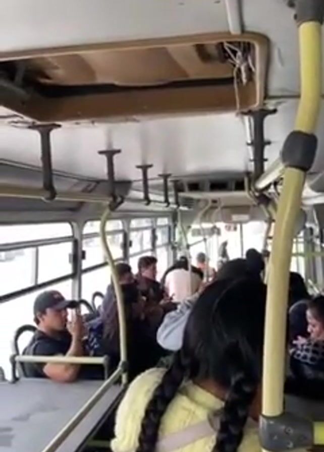 The camera films from inside a bus, likely transporting passengers at an airport. Several people are visible, standing and seated. The bus's interior is worn. The camera pans to show a view of an airport tarmac with a plane visible through the bus window.