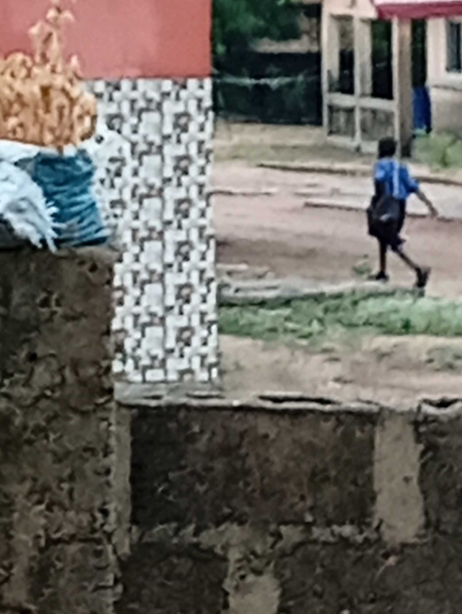 A photograph taken in Adankolo, Nigeria, shows a child in a blue shirt and black shorts, carrying a dark bag and walking on a dirt road. The background includes a building with a partially visible red roof and white walls. A structure with a brown exterior and a tiled section is in the foreground. Green grass patches are visible along the roadside.
