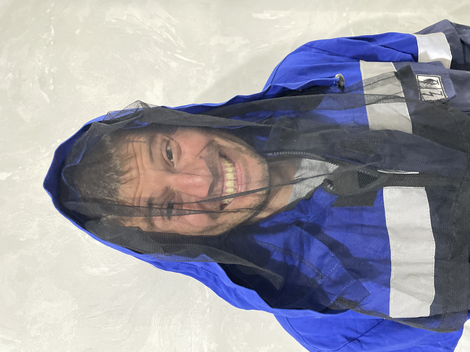 A person smiles at the camera, their face partially obscured by a black mesh hood