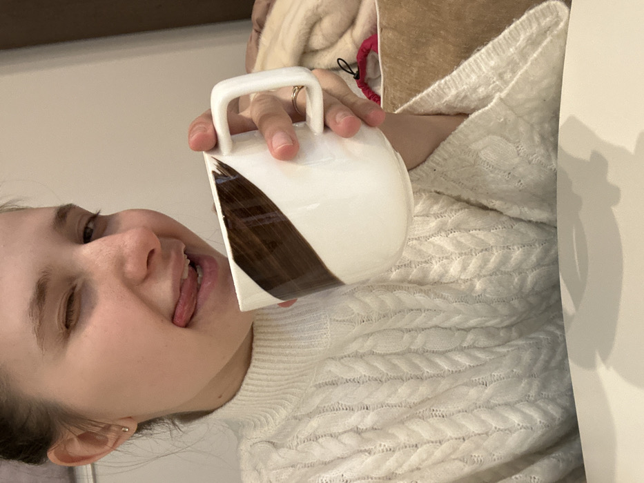 The image displays an indoor scene located in Khimki, Russia. A young individual, presumably female, is depicted from the upper chest level, situated in front of a light-colored surface, likely a table. She is attired in a light-colored, cable-knit turtleneck sweater. Her left eye is closed in a wink, and her tongue is extended, licking the corner of her mouth. Her right hand, which has a thin ring on the ring finger, holds a white ceramic mug featuring a broad, diagonal dark brown stripe and a square-shaped handle. In the upper right background, a light-colored, plush material, possibly fur, is partially visible. Below this, a dark bag with a pink drawstring is seen, possibly resting inside a brown paper bag or box. The background to the left consists of a plain, light-colored wall. A shadow from the mug and hand is cast upon the foreground surface.