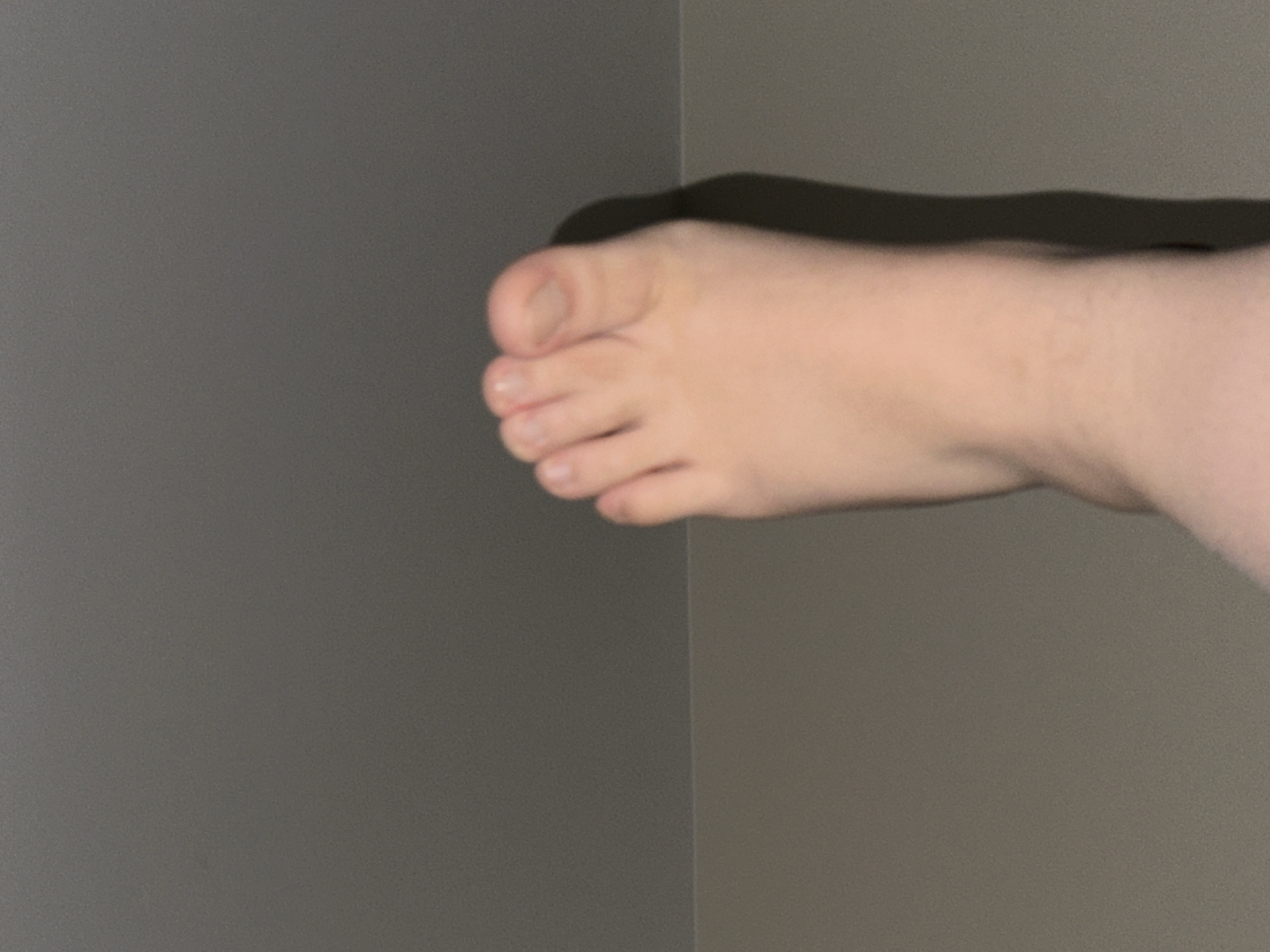 A single human right foot, light-skinned and partially hairy, is depicted against a plain, two-tone background. The foot extends from the lower-right portion of the frame towards the upper-center, displaying five toes with unpainted, intact toenails. A distinct shadow is cast to the right of the foot, suggesting a light source originating from the left. The background is divided horizontally into two sections: an upper medium-dark grey plane and a lower lighter grey plane, separated by a clean horizontal line. No other subjects, objects, or environmental identifiers are present in the image. The specific location within Sofia, Bulgaria, cannot be determined from the visual evidence provided.