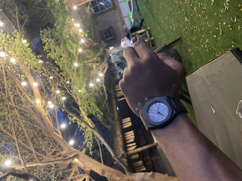 The image depicts an outdoor nighttime scene in Alagba, Nigeria. A person's left forearm and hand, exhibiting a dark skin tone, occupy the foreground. The hand is holding a lit cigarette, from which a plume of smoke is actively rising. A dark-colored wristwatch with an octagonal bezel and a textured, patterned dial is worn on the wrist. The forearm rests on a dark, flat surface, likely a table. The background features several large trees, their branches extensively draped with glowing string lights, providing ambient illumination against a dark sky. To the left-midground, a structure with a thatched roof is visible. To the right-midground, a building-like structure with a single window is present. The ground beneath the trees is covered in green artificial turf or manicured grass, interspersed with scattered yellow-brown debris. A wooden stool or low table is partially visible on the grass in the right midground.