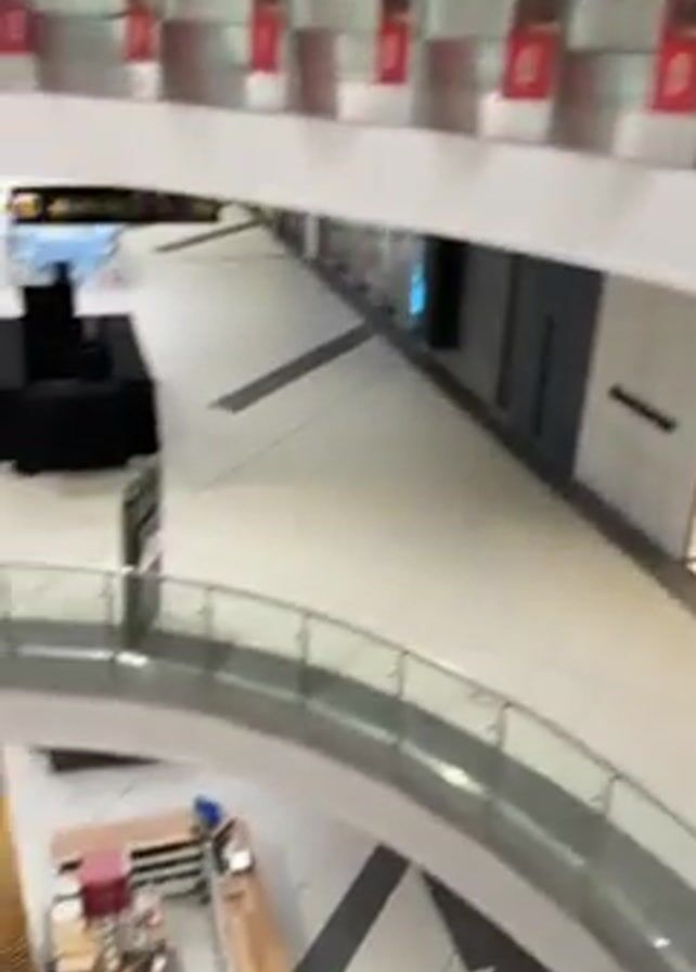 interior of a shopping mall. The camera begins focusing on a Subway restaurant on an upper level. It then pans to show the lower level of the mall, revealing kiosks and empty storefronts. The camera then moves onto an escalator traveling downwards. The escalator has advertisements for fast food on its side panels. A person wearing a backpack and light colored clothing is standing on the escalator in front of the camera. The view from the escalator shows multiple levels of the mall with various shops.