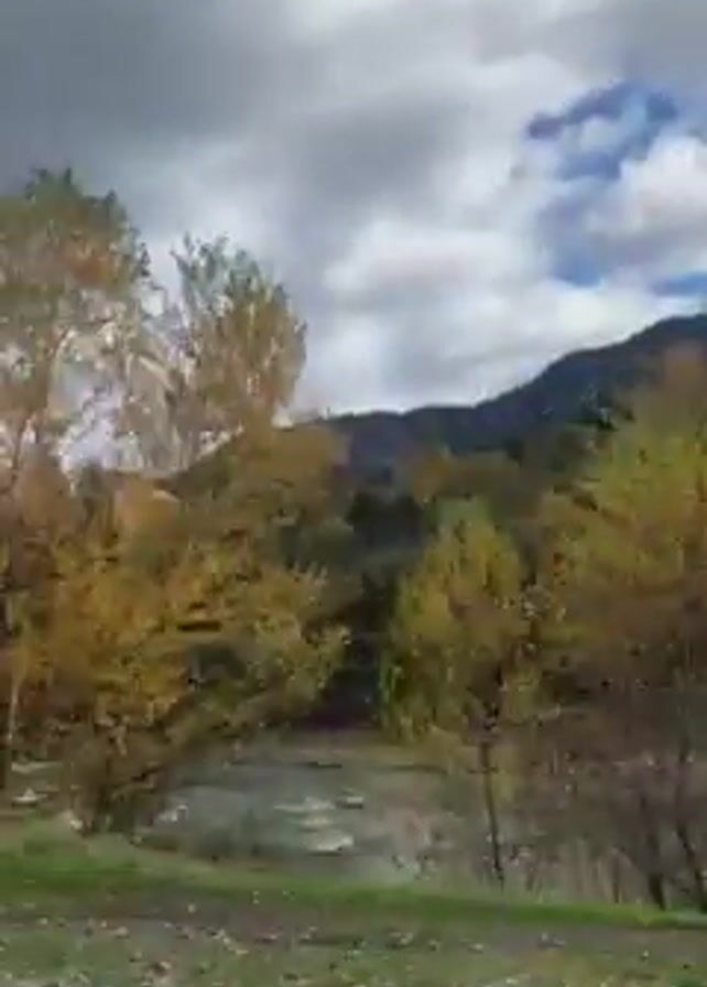 landscape viewed from a moving vehicle. There's a body of water, likely a river or lake, with trees along the bank. The trees are in various stages of autumn, with some having yellow leaves and others appearing bare. In the background, there is a forested hillside. The sky is overcast with grey and white clouds. The video is taken at ground level from within the moving vehicle.