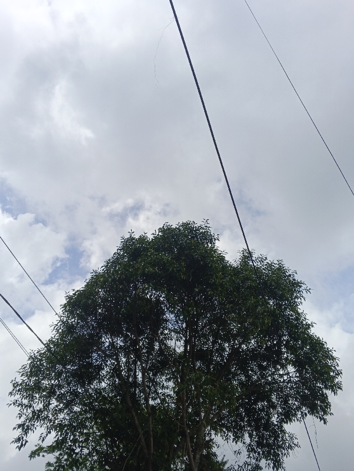 The image captures an outdoor scene in Pinnwe, Myanmar, from a low-angle perspective, looking upwards towards the sky. A large, dense green tree with abundant foliage dominates the lower two-thirds of the frame, its canopy obscuring the majority of its trunk and branches. Above the tree, a partially cloudy sky is visible, featuring white and grey clouds with intermittent patches of lighter blue sky. Three dark utility cables traverse the upper portion of the frame diagonally. A thick, dark cable runs from the upper right quadrant towards the lower left. A second, thinner dark cable runs roughly parallel but higher in the upper left quadrant. A third, very thin, light-colored filament or strand is observed arcing downwards in the upper left, appearing to hang from or near one of the utility lines. No individuals, vehicles, or structures are discernible within the frame.