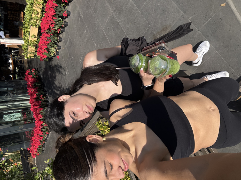 An outdoor scene in Cuernavaca, Mexico, depicts two women standing on dark gray tiled pavement under strong direct sunlight, casting sharp shadows. The specific location within Cuernavaca is not visually discernible. The woman in the foreground on the left, partially cropped, appears to be taking the photograph. She has dark hair styled in a bun, wears a black one-shoulder sports top, and a gold stud earring is visible in her right ear. Her head is angled away from the camera with a slight smile. Behind her, the second woman has dark hair pulled into a ponytail. She wears a black tank top, black shorts, and white athletic shoes. A black garment is draped over her left arm. She holds two clear plastic cups filled with green smoothies, featuring domed lids and metal straws. In her right hand, below the smoothies, she holds a smartphone in a clear case. A silver-colored smartwatch is visible on her left wrist, and her fingernails are painted red. Her expression is neutral as she looks towards the camera. The background features a modern building with large glass windows reflecting the sunlight, through which interior seating of what appears to be a restaurant or cafe is visible. Along the building's base and next to a raised planter box with green foliage, numerous potted red Poinsettia plants are arranged in rows.