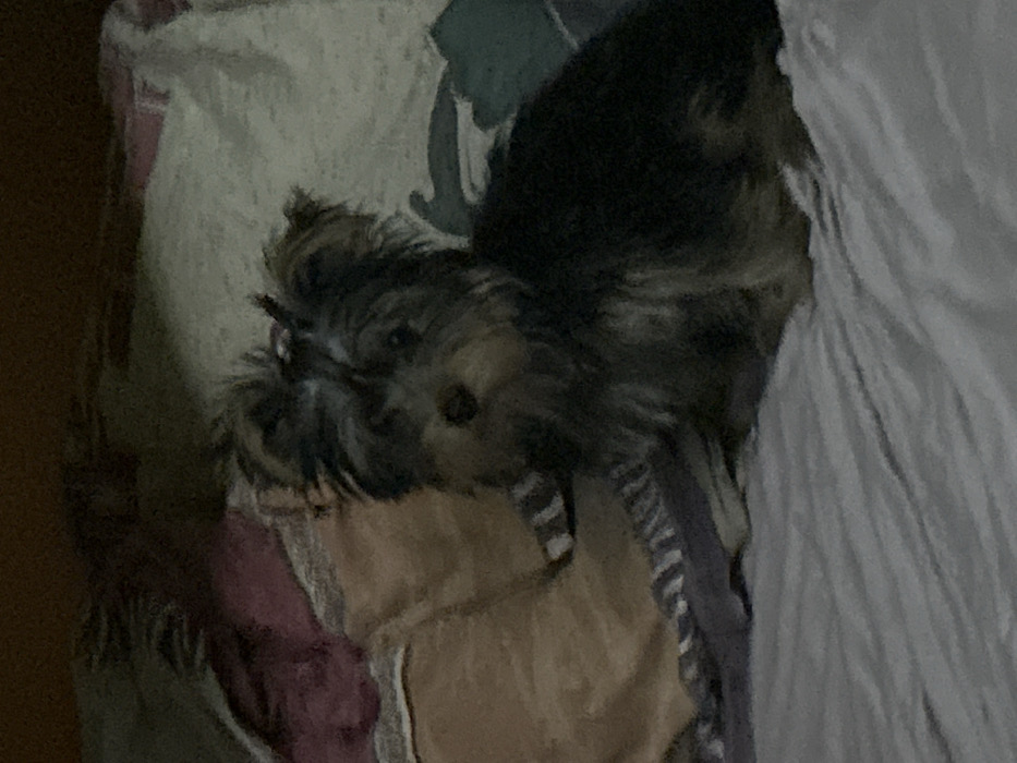 - "A small, multi-colored dog, predominantly dark grey-black with tan-blonde markings on its face and paws, sits upright on a bed" by FM-ZTQZg2, licensed under CC BY 4.0