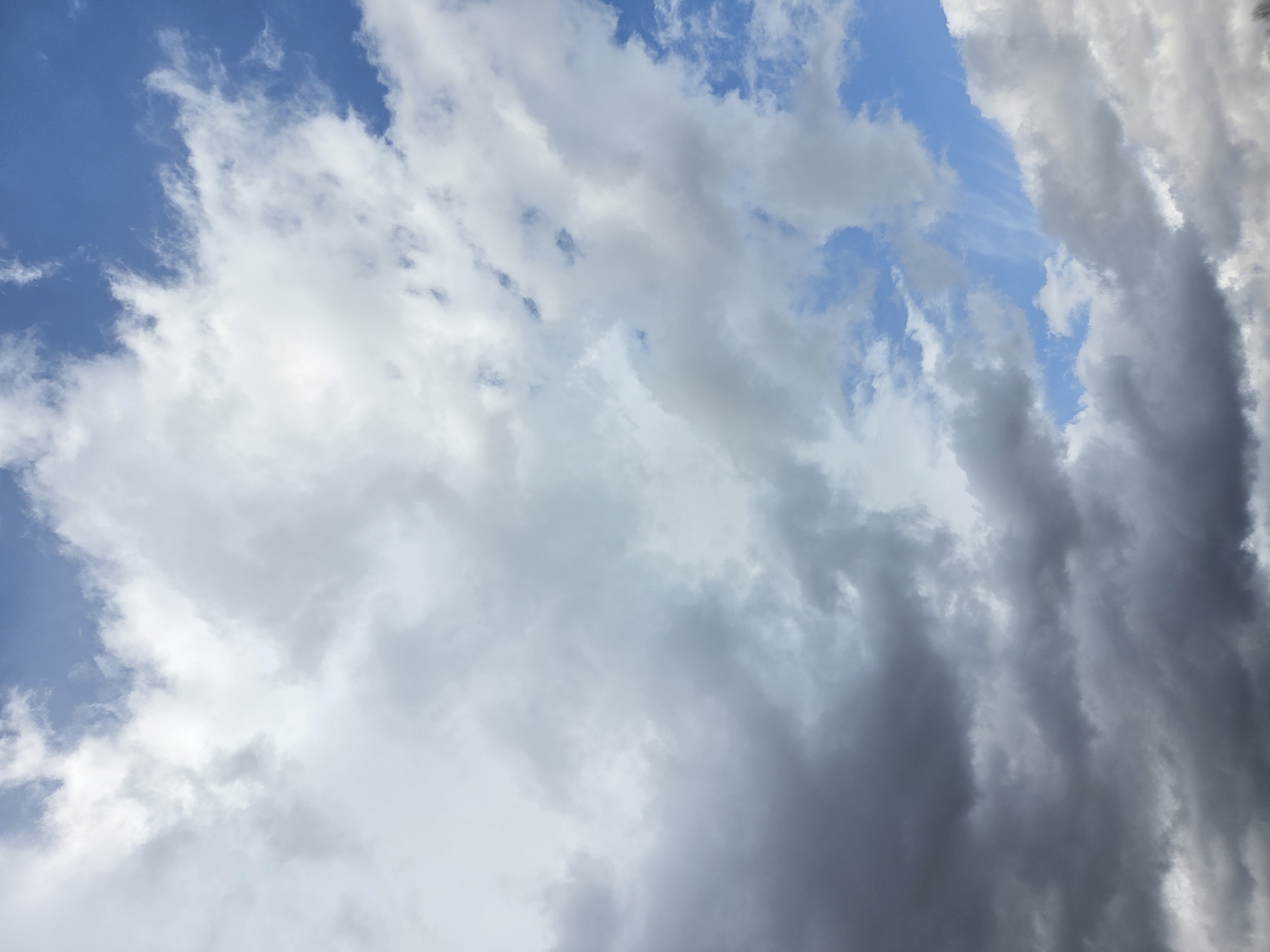 The image displays a sky over the city of Troyan, Bulgaria. The upper portion of the frame features scattered white and light grey clouds interspersed with areas of clear blue sky. The lower portion is dominated by dense, dark grey cloud formations. A clear visual gradient exists from the lighter, more fragmented clouds and blue sky in the upper right quadrant to the heavier, darker cloud mass in the lower left. No ground features, artificial structures, individuals, or objects are visible. The scene depicts a sky with varying cloud density and light conditions.