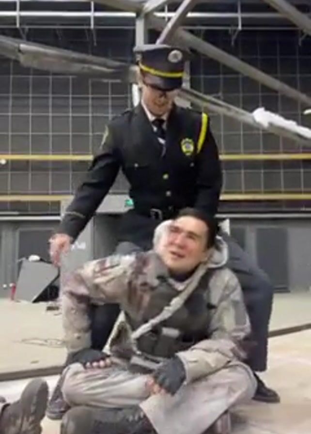 Two men, apparently actors, are goofing around in what appears to be a movie set or studio. One man is dressed in a dark police uniform and the other man is sitting on the floor wearing a military style camouflage outfit that is covered with what looks like dirt and blood. The man on the ground smiles up at the man in the police uniform, who is standing behind him. The background is a large room with a metal framework structure, grid-like walls and scattered debris.