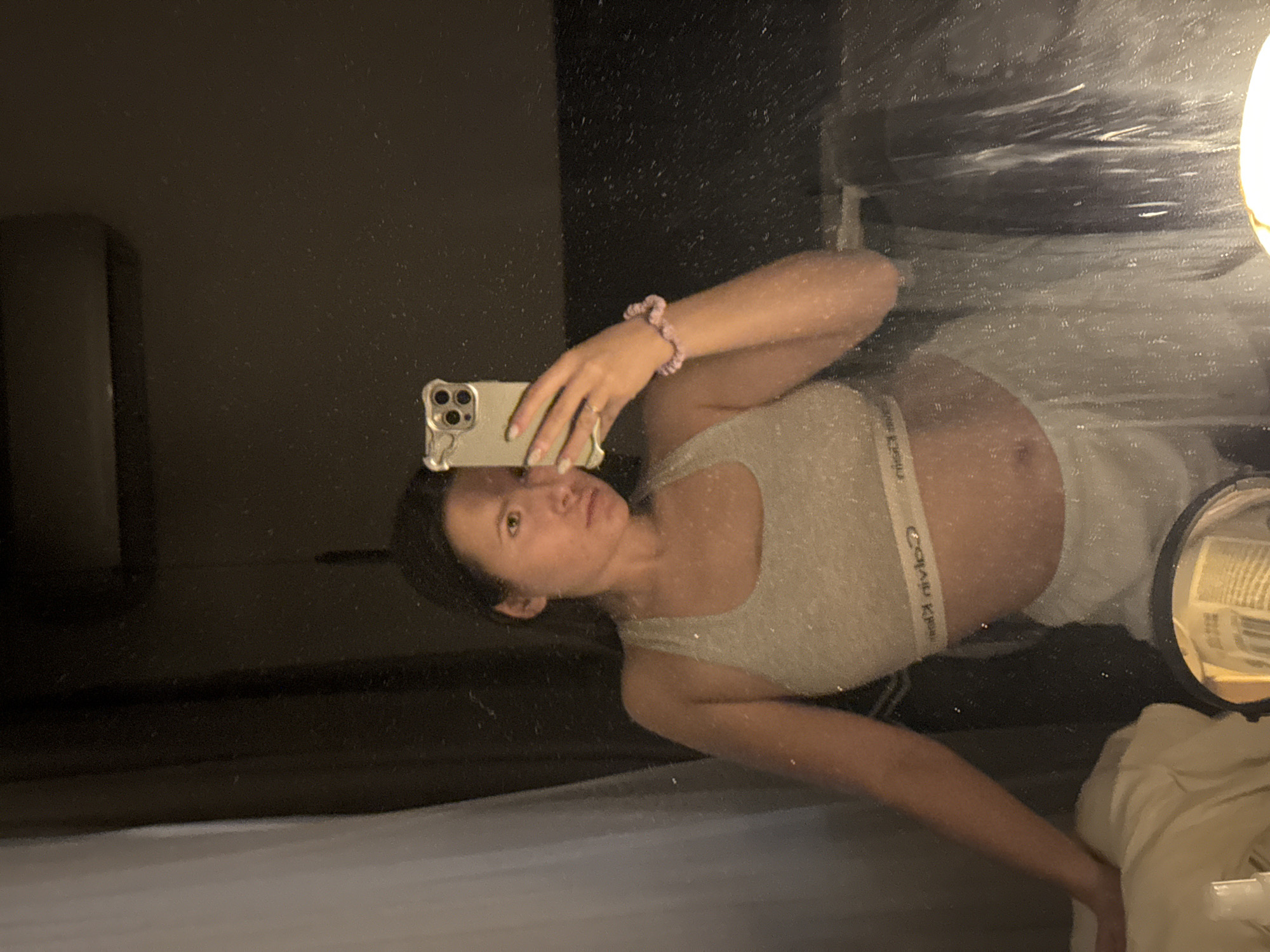 A female subject is captured in a mirror selfie within an indoor setting in Vnukovo, Russia. The subject, positioned centrally, holds a light-colored smartphone with a multi-lens camera array in her right hand, pointed towards the mirror. She wears a light grey Calvin Klein sports bra with the brand name visible on the elastic band, paired with matching light grey sweatpants. A light pink/purple scrunchie is on her right wrist. Her dark hair is pulled back, and her face, partially illuminated by a localized light source from the lower right, displays a neutral expression. The mirror surface exhibits numerous small reflections or specks. To the left of the subject, a sheer white curtain is visible. In the upper right quadrant of the reflection, a dark-colored wall-mounted unit, possibly an air conditioning unit, is present. At the bottom center, a small, circular magnifying mirror reflects a blurred interior view, adjacent to a white spray bottle or similar container partially visible on the bottom left. The overall lighting is dim, relying on artificial sources, including one that casts a distinct glow from the bottom right of the frame.