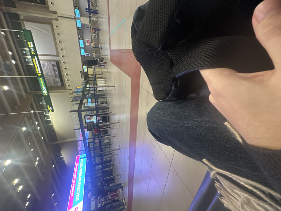 - "The image provides a low-angle, first-person perspective from a seated individual within an airport terminal, specifically identified as Treviso Airport in Treviso, Italy, due to visible directional signs referencing "Canova Lounge" and "Imbarco Gates" by FM-us8SV2, licensed under CC BY 4.0