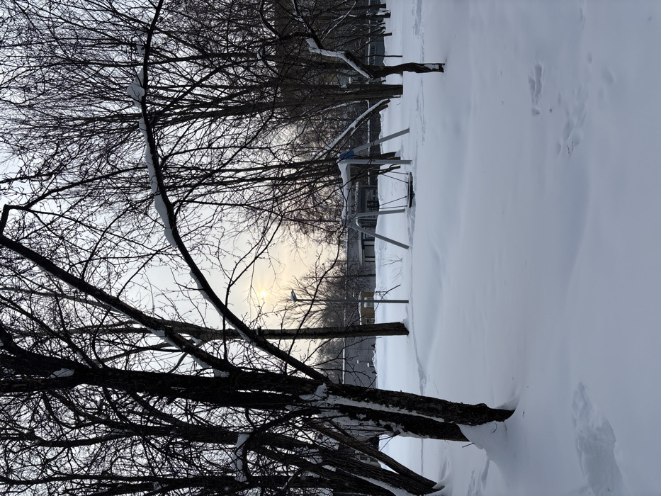 A winter scene shows snow-covered ground, with bare trees in the foreground and middle ground. The trees are dark in contrast to the bright white snow. There's a glimpse of a building or structure partially obscured by snow and trees. The sun is visible through the branches, creating a bright spot in the sky. Footprints are seen in the snow-covered ground.