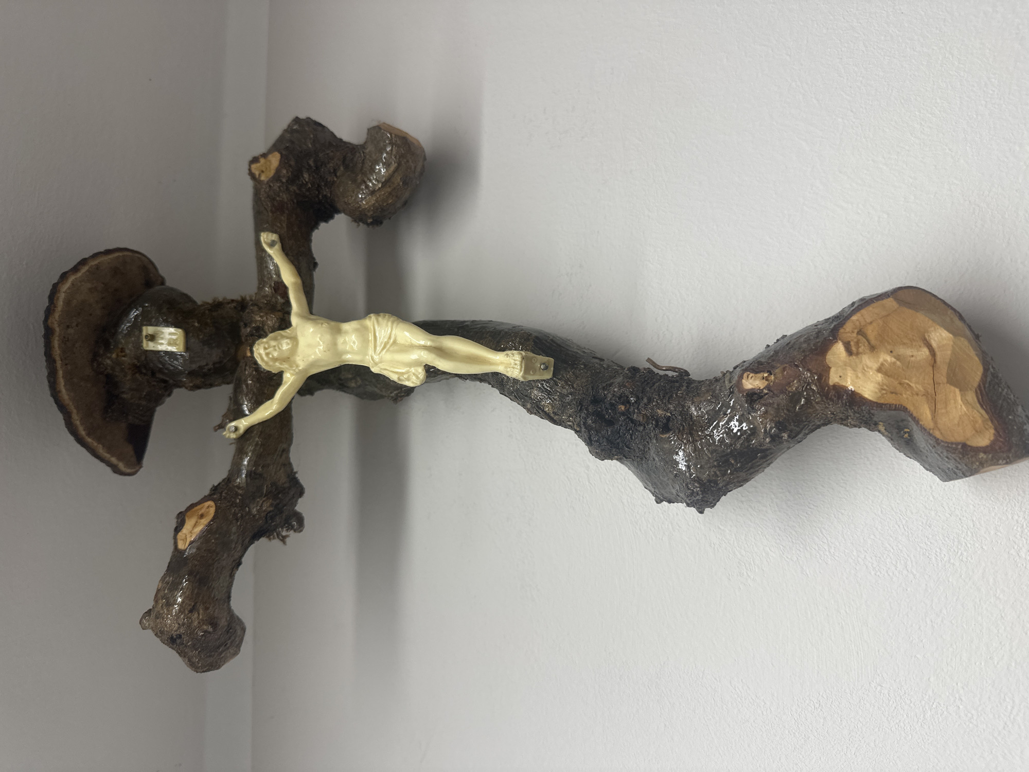 The image depicts a crucifix hanging on a white wall. The cross itself is made of a dark, gnarled tree branch with varnished surface, resembling driftwood. A pale, ivory-colored figure of Jesus is attached to the cross. The location is not discernible from the image.
