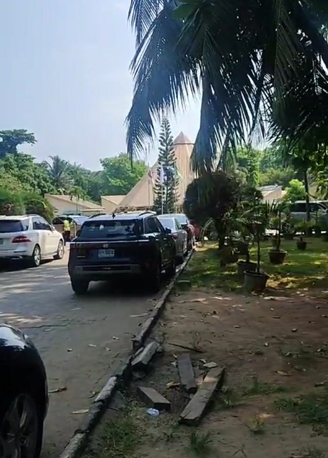 street scene in what appears to be a tropical or subtropical location. There are several cars parked along the side of the road, including a white SUV, a dark-colored SUV, and other vehicles. Palm trees and various other trees and plants are visible, providing shade. In the background, there is a structure that appears to be shaped like a pyramid. On the right side of the video, there is a grassy area with picnic tables and people sitting and relaxing. The ground is mostly dirt and partially covered with grass. The overall atmosphere is sunny and relaxed.
