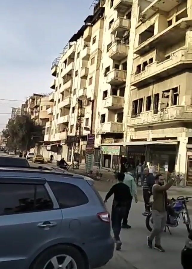 street scene in a city with damaged buildings. There are many people walking, standing, and driving on the street. Some of the buildings appear to be war-torn or in disrepair. A black van with loudspeakers on its roof is driving down the street. People are dressed in casual clothes. A man is recording with his cell phone. The sky is overcast.