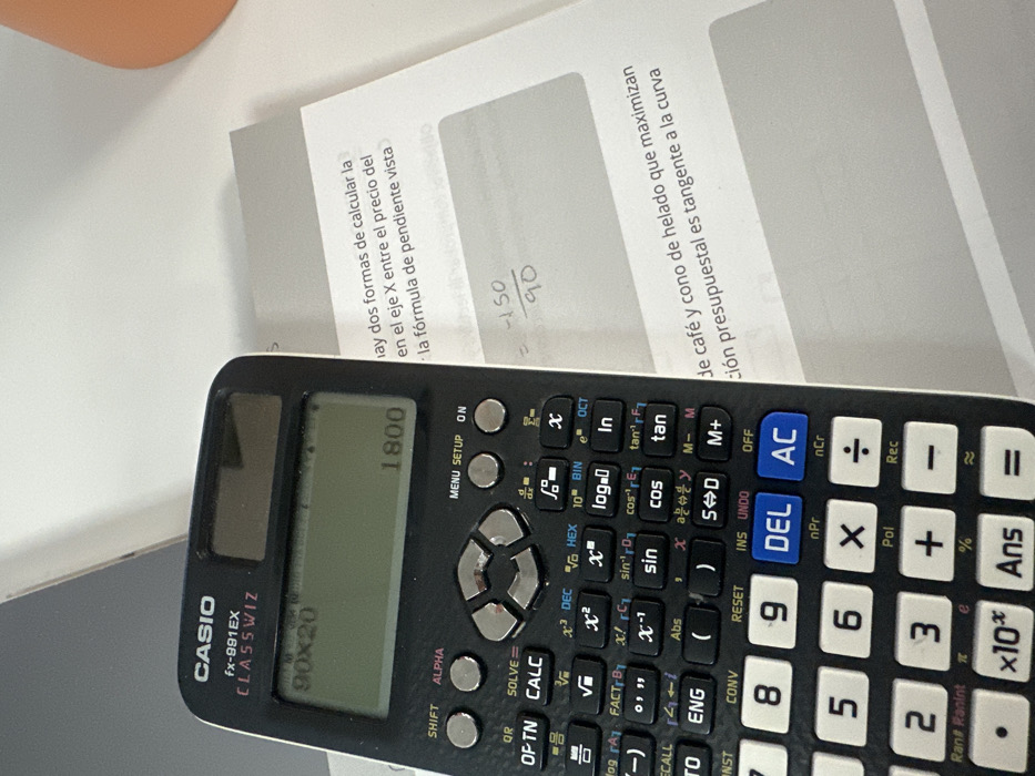 The image displays a black Casio fx-991EX CLASSWIZ scientific calculator positioned on a light-colored surface. The calculator's screen indicates the input "90x20" and the computed result "1800". Minor wear is discernible on the calculator's silver directional pad buttons. To the right of the calculator, a white sheet of paper is partially visible, featuring printed Spanish text. Visible segments of the text include "...hay dos formas de calcular la...", "...en el eje X entre el precio del...", "...la fórmula de pendiente vista...", "...de café y cono de helado que maximizan...", and "...ción presupuestal es tangente a la curva". Handwritten notation showing " = -150 / 90" is also present on the paper. A dark grey object is partially visible behind the calculator in the upper left quadrant. An orange-brown object, resembling a cup or container, is partially visible in the upper right background. The scene is situated in Monterrey, Mexico. No individuals are present.