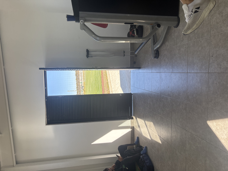 An open door reveals a view of a baseball field under a clear blue sky. Inside, crutches lean against the wall next to exercise equipment. A person wearing sneakers is partially visible in the upper right. Two seated individuals are using cellphones in the lower part of the frame. The floor is tiled and sunlight streams in through the open door, creating strong shadows.