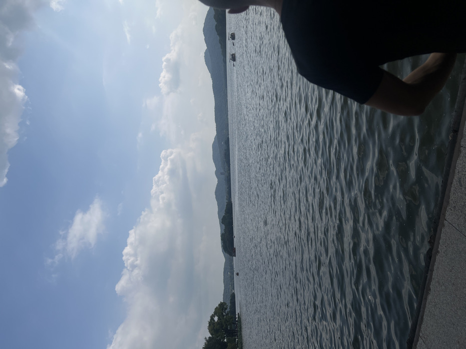 The image depicts a daytime scene at West Lake in Xihu District, Hangzhou, China. In the immediate foreground, a grey paved stone embankment borders a large body of water. Partially visible on the right, an individual with a shaved head is seen from behind, wearing a dark (likely black) short-sleeved shirt, facing the lake. The expansive water surface exhibits subtle ripples. Scattered across the lake are several small boats, including a red boat positioned in the mid-left distance, and two lighter-colored paddle boats further right. The far left shoreline features a patch of aquatic vegetation near the water's edge. The background consists of a series of vegetated hills stretching across the horizon, with a faint, dark, pagoda-like structure visible on a distant hill. The sky above is blue with scattered white cumulus clouds of varying sizes.
